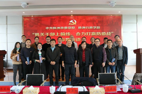 4月7日下午,市委党校(行政学院)在学员一号楼四楼会议室举行"机关干部上前线、合力打赢防疫战"专题座谈会,欢迎校(院)派驻社区抗击疫情工作队队员胜利凯旋。常务副校(院)长唐卫湘出席座谈会并讲话,副校(院)长周康波主持会议,副校(院)长乔英镭、黄夏先出席会议。