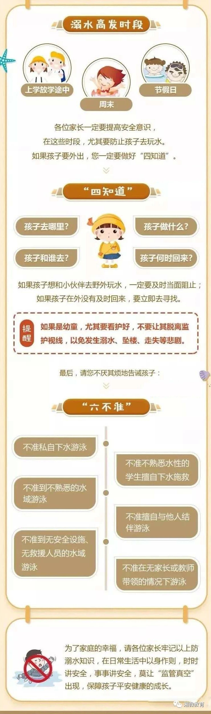 随着炎热的夏天到来,因青少年儿童冒险玩水导致溺水身亡的惨痛事件时有发生。溺水,已是孩子的头号杀手,防溺水教育已刻不容缓。为了孩子的健康成长,我们迫切希望各位家长积极配合,履行孩子的监护人职责,不论你有多忙,时刻把孩子的安全教育放到首位,认真做好安全教育工作。现将有关知识提醒如下: