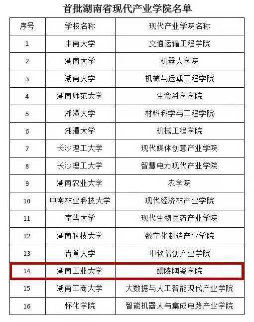 近日,湖南省教育厅、湖南省工业和信息化厅公布湖南省首批现代产业学院名单,湖南工业大学醴陵陶瓷学院与中南大学交通运输工程学院、湖南大学机器人学院等一同上榜。