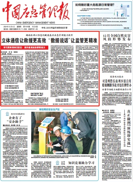 12月5日,《中国应急管理报》头版头条刊发了《立体通信让救援更高效“数据说话”让监管更精准》的报道,向全国推介我市“以信息化赋能基层应急管理能力提升”的工作经验与做法。