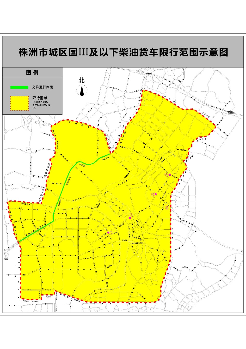 玉龙路、金龙西路、荷塘大道、新华东路、东环北路、东环路、南环路、建宁大桥、西环路、湘江大道、南泉东路、栗雨南路、西站南路、湘芸路、滨江北路、清水塘大桥、清水塘大道、建设北路、清石路、时代大道、迎宾大道形成的合围区域,全天24小时禁止国三及以下排放标准柴油货车通行。其中,临界道路及株洲大道—东湖立交—石峰大桥—响田路—田心立交一线允许通行。