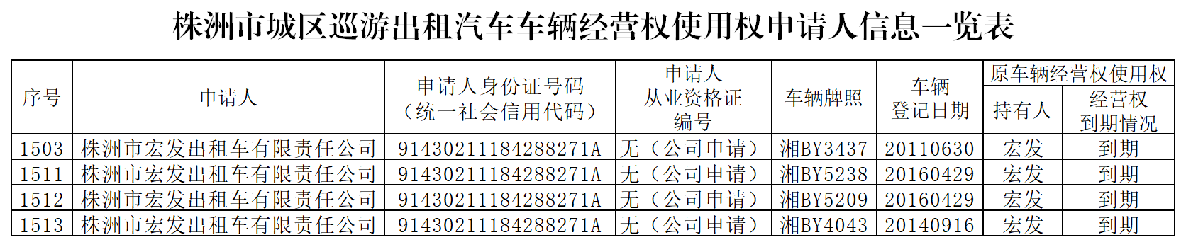 根据《株洲市城区巡游出租汽车行业深化改革工作方案》,株洲市宏发出租车有限责任公司向市交通运输局提出湘BY3437等4辆出租汽车实际出资人为该企业且无固定承包经营者,该公司已将上述车辆所有权确认为公司所有(企业已将车辆相关信息进行公示且无人提出异议),并向市交通运输局提出巡游出租汽车车辆经营权使用权申请。现将以上巡游出租汽车车辆经营权使用权申请人信息进行公示,公示期为2019年4月25日至4月29日(不含节假日)。