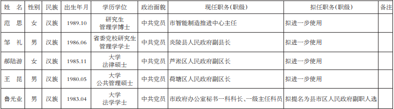 为了加强对干部选拔工作的监督,提高识别和任用干部的准确程度,现对市委常委会会议研究决定的下列拟任人选进行任前公示: