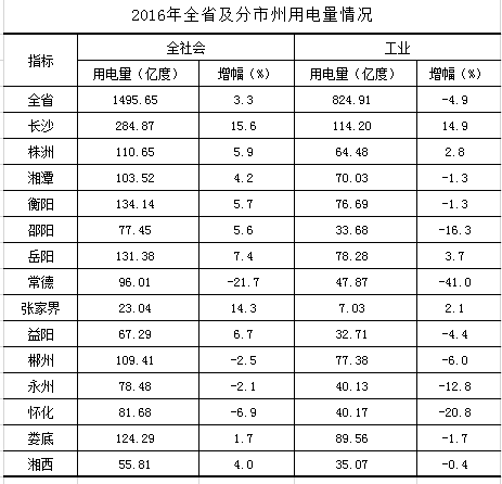 2016年,株洲全社会用电量累计为110.65亿千瓦时,居全省第5位;增长5.9%,居全省第5位,增长主要来源自城乡居民和第三产业用电量的较快提升。