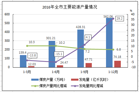 2016年,全市原煤生产量累计562.06万吨,增长6.8%,比上年高出12.9个百分点。其中,无烟煤产量552.33万吨,增长7.0%;一般烟煤产量9.73万吨,下降2.5%。