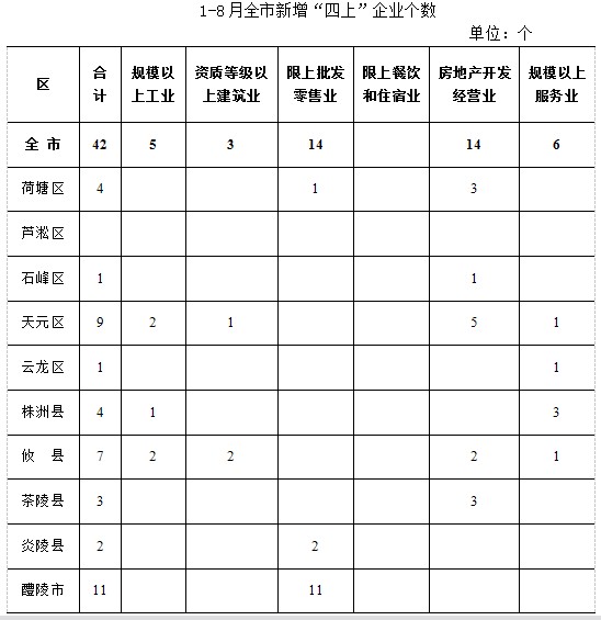 ㈠全市新增企业42家。基本单位统计数据显示,截止8月末,全市新增“四上”企业42家。其中:规模以上工业新增5家,限额以上批发零售业新增14家,房地产开发企业新增14家,规模以上服务业新增6家,资质等级以上建筑业新增3家。