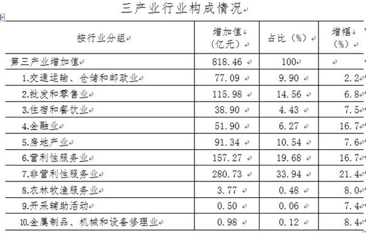 ㈢新兴服务业快速发展。金融业、信息服务业等现代服务业快速增长,成为服务业新的经济增长点。2015年金融业实现增加值52.9亿元,比上年增长16.7%,占服务业增加值的比重达6.3%,同比提高0.2个百分点。金融机构实现存款余额2411.9亿元,增长16.8%,实现贷款余额1234.1亿元,增长10.8%。旅游产业快速发展,全年旅游人数3546万人次,增长16.1%,旅游总收入233.3亿元,增长16.2%。