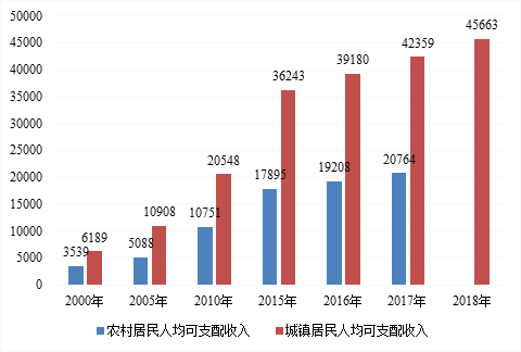 图5: 2000-2018年石峰区城乡居民人均可支配收入(元)