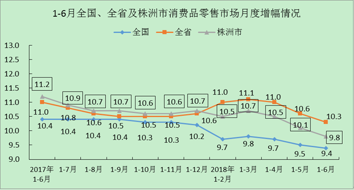 (一)从总体情况看,全市消费品市场运行总体平稳。1-6月,全市实现社会消费品零售总额462.3亿元,增长9.8%,增速比1-5月回落了0.3个百分点,与全省同步回落0.3个百分点,高于全国0.4个百分点,低于全省0.5个百分点,在全省的排位与1-5月持平;与第12位的长沙、第11位的湘潭运行趋势一致,差距缩小。