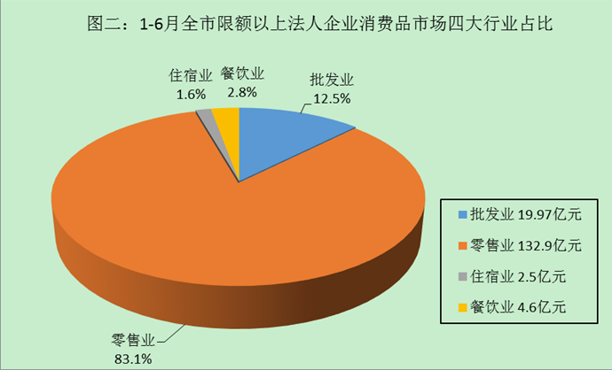(一)从行业看,限上批零住餐四大行业中占比份额最大的零售业大幅回落。1-6月,全市限额以上批零住餐四大行业呈现“一升三落”态势,但是占比份额最大的零售业大幅回落,影响全市限上法人零售额增幅的提升。