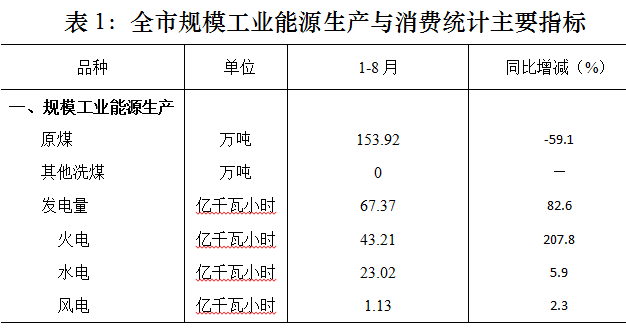 1-8月,规模工业企业累计发电量67.4亿千瓦时,同比增长82.6% ,较1-7月同比提升8.3个百分点,其中,火力发电量43.2亿千瓦时,同比增长207.8%;水力发电量23亿千瓦时,同比增长5.9%;风力发电1.1亿千瓦时,同比增长2.3%。