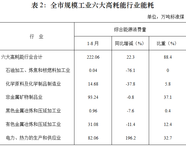 1-8月,全市规模工业37个行业中20个行业综合能源消费量下降,1个行业持平,16个行业增长。其中,高耗能行业综合能源消费量为222.1万吨标煤,增长22.3%,较1-7月提升2.2个百分点。特别是大唐华银攸县去年9月投产,同期无基数,电力、热力的生产和供应业综合能源消费量为82.1万吨标煤,增长196.2%,较1-7月提升18.6个百分点。
