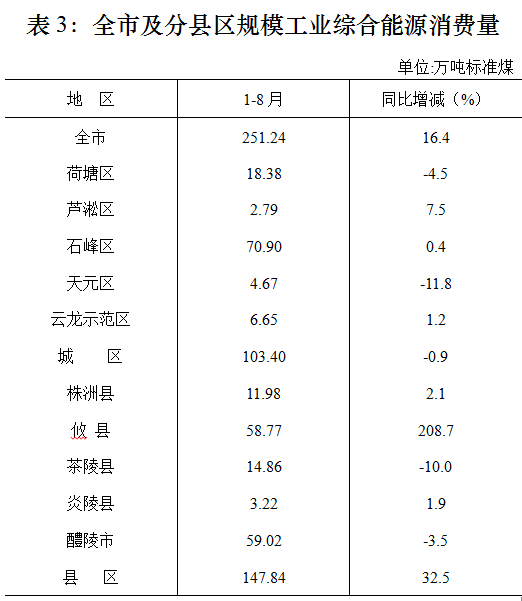 1-8月,全市规模工业运行平稳,实现增加值累计682亿元,同比增长6.8%,与1-7月持平,其综合能源消费量累计251.2万吨标煤,增长16.4%,较1-7月提升2.1个百分点,是今年能耗逐月回落以来的首次小幅提升,剔除攸县大唐影响,同比下降3.8%,与1-7月持平。