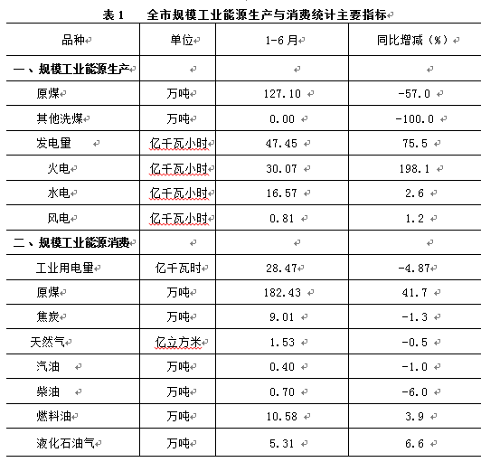 (一)能源产品产量普遍增长。上半年,全市的3种能源主要产品,原煤产量大幅下滑,火力发电量成倍增长。