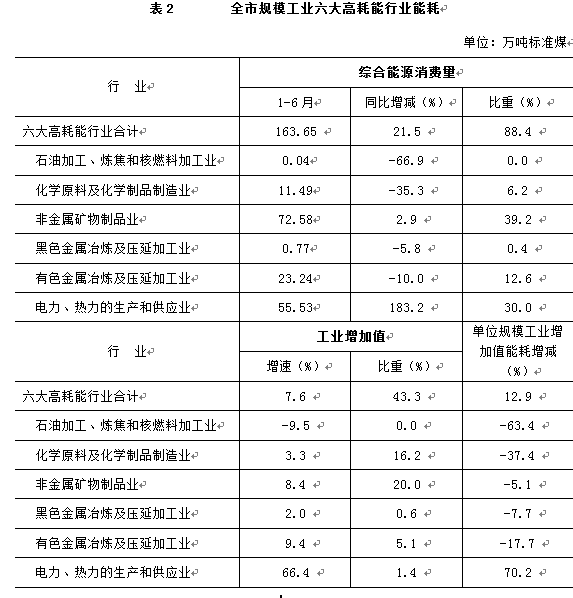 (三)六大高耗能行业能源消费较快增长。上半年,六大高耗能行业生产形势较好,其增加值同比增长7.6%,综合能源消费量合计为163.65万吨标准煤,同比增长21.5%,比1-5月回落5.3个百分点。单位增加值能耗同比增长12.9%,比一季度回落5.2个百分点。