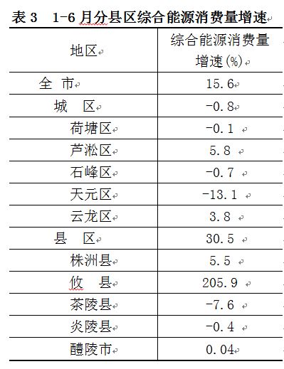 (四)城区能耗小幅下降,县域能耗快速增长。上半年,城市五区规模工业综合能源消费量为75.4万吨标准煤,同比下降0.8%;比1-5月回落5.9个百分点。其中,下降最快和增长最快的是高新区天元区下降13.1%、芦淞区增长5.8%。五县规模工业综合能源消费量为109.7万吨标准煤,同比增长30.5%;比1-5月回落3.4个百分点。其中,茶陵县、炎陵县分别下降7.6%和0.4%,攸县、株洲县、醴陵市分别增长205.9%、5.5%、0.04%,攸县剔除攸县大唐后下降21.8%。