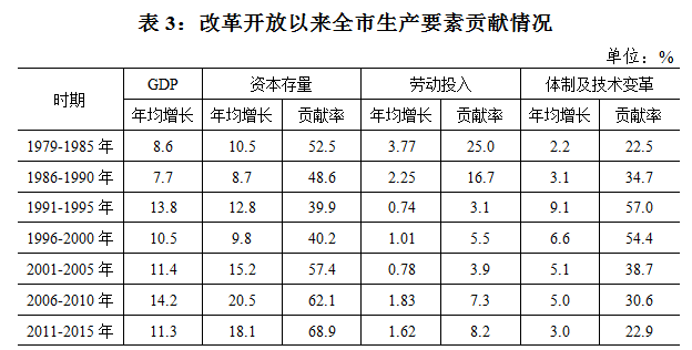 1979-2015年,我市经济年均增长11.2%,在资本产出弹性系数α=0.4302和劳动产出弹性系数β=0.5698的影响下,由一系列基础数据计算,可得资本投入、劳动投入和体制及技术变革对全市经济增长的贡献率分别为52.8%、9.9%和37.3%。
