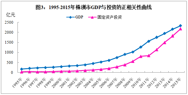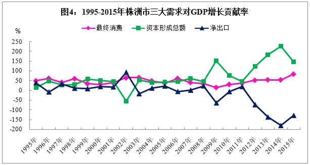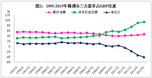 1、投资需求是拉动经济增长的主要因素。1995-2015年,平均投资率为46.9%,对经济增长的年平均贡献率为68.5%。通过对GDP和固定资产投资作曲线图发现,我市投资与总产出高度线性正相关。表明当前投资的不断扩大,为全市经济的快速增长创造了有利条件。