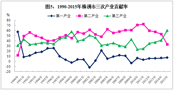 城镇化推进将带来聚集效应和扩散效应,能够推进农业产业化进程,为工业化的发展提供良好的环境,促进第三产业规模不断壮大,还能引领区域的整体发展、协调发展,进而促进经济的增长。从城镇化的影响效应看,1995-2015年我市的城镇化水平与人均GDP的平均影响系数在0.56左右,城镇化水平的提高对经济增长有较为明显的促进作用。2015年,我市芦淞区、株洲县、醴陵市、天元区和攸县的GDP增速分别高于全市平均水平0.7、0.6、0.6、0.5和0.3个百分点。区域经济快速发展对全市经济的贡献更多的体现在经济总量和增量贡献上,而各县域和城区相互间的产业联动和区域协调发展方面仍然不足,特别是城区对县域产业带动作用不强,甚至部分区域还因产业结构雷同造成不良竞争,影响了拉动效应的发挥。