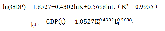 新古典增长理论认为,资本、劳动力和技术进步等因素的长期作用是经济增长的动力。本文应用柯布—道格拉斯生产函数,选用1979-2015年的GDP、资本投入(K,以永续盘存法计算)和劳动力投入(L,用平均从业人员乘以平均工资)作为变量,利用Eviews6.0进行回归分析,得到生产函数的估计式为: