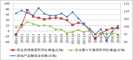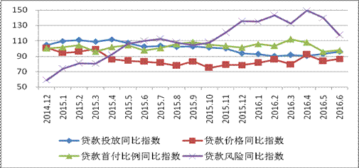 6月末房地产金融综合同比指数100.57%,环比指数104.78%,从整体走势看,自2016年以来呈现稳中有升的发展态势。由于2015年金融管理部门和各级地方政府频繁出台促进房地产市场健康发展的政策措施,去年同期房地产金融指数基数较高,导致今年前五个月房地产金融综合同比指数相对处于低位,6月份数值因今年2月出台的新政效应显现走高。从环比指数看,今年以来稳中有升,反映金融对房地产市场支持力度加大,有力提振了市场信心,刺激楼市销售回暖,化解库存压力。随着房地产金融综合指数升温,2016年上半年市辖区商品房销售面积增速大幅提升,同比增长10.63%,与此同时商品住房累计可售面积增速波动下行,2-6月持续负增长,整体反映库存压力逐步缓解,去库存状况改善。