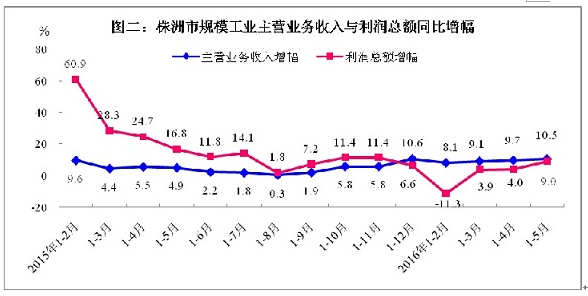 (三)规模企业效益逐步回暖。1-5月,株洲市规模以上工业企业实现主营业务收入1088.69亿元,增长10.5%,较1-4月提高0.8个百分点,较去年同期提高5.6个百分点;实现利润49.2亿元,增长9%,较1-4月提高5个百分点,较去年同期回落7.8个百分点;企业亏损面为8.85%,较去年同期缩小2.2个百分点。亏损企业亏损总额为7.14亿元,下降20.4%。