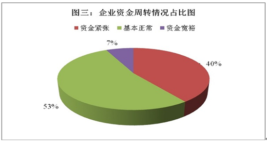 (二)企业资金周转依然偏紧。通过工业经济运行监测调查显示,40%的企业资金紧张,53%的企业基本正常,7%的企业认为资金宽裕。从企业规模看,45%的中小企业认为资金紧张,32%的大型企业资金紧张。从行业看,通用设备制造业、有色金属冶炼和压延加工业、化工行业资金紧张情况突出,分别占比100%、75%和71.4%。