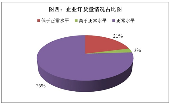 (三)企业订单低于同期水平。通过工业经济运行监测调查显示,21%的企业订货量低于正常水平。只有3%的企业订货量高于正常水平,76%的企业订货量处于正常水平。从企业规模看,订货量低于正常水平的大型企业占24%,中型企业占17.5%,小微企业占22.8%。企业订货额普遍低于去年同期水平。调查结果显示,1-6月份,100家企业产品订货额下降10.8%。其中,大型企业订货额下降7.2%,中型企业下降31.5%,小型企业增长12.2%,微型企业下降14.5%。从主要行业看,铁路、航空航天和其他运输设备制造业订货额下降18.3%,纺织服饰业下降17.8%,有色金属冶炼和压延加工业下降16.3%,通用设备制造业下降19.1%。