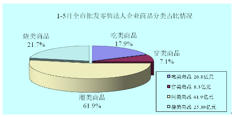 (三)从商品类别看,吃穿用烧四类商品“两增两降”。1-5月份,株洲市限额以上批发零售法人企业实现吃类商品零售额20.76亿元,同比增长29.5%,比1-4月提高1.2个百分点;穿类商品8.3亿元,同比增长8.1%,比1-4月提高0.1个百分点;烧类商品25.27亿元,同比下降12.3%,比1-4月下降1.6个百分点;用类商品61.9亿元,同比增长16.4%,比1-4月下降0.3个百分点。