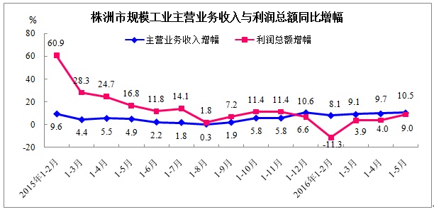 (四)规模企业效益逐步回暖。1-5月,株洲市规模以上工业企业实现主营业务收入1088.69亿元,增长10.5%,较1-4月提高0.8个百分点,较去年同期提高5.6个百分点;实现利润49.2亿元,增长9%,较1-4月提高5个百分点,较去年同期回落7.8个百分点;企业亏损面为8.85%,较去年同期缩小2.2个百分点。亏损企业亏损总额为7.14亿元,下降20.4%。