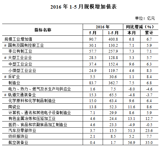 (一)航空、汽车等新兴行业增长较快。1-5月,在主要行业中,一些新兴产业的发展较快:航空航天器及设备制造业由于订单增加、投入提高、生产线效率提升等原因实现较快增长,完成增加值1.67亿元,增长35%,拉动规模工业增长0.1个百分点;汽车制造业主要由于株洲北汽继续呈现高速增长的态势,带动汽车相关配件生产企业生产向好,完成增加值15.55亿元,增长23.6%,拉动规模工业增长0.7个百分点;醴陵在第119届广交会上签订6239万美元的订单,其中6个月以内的中短期订单占全部订单近7成,陶瓷企业生产得到大幅提升。陶瓷制品制造所在的行业大类非金属矿物制品业完成增加值69.86亿元,增长9.5%,拉动规模工业增长1.6个百分点。另外,有色金属冶炼和压延加工业(有色金属新材料深加工产业)今年也保持了较好增长态势,1-5月完成增加值24.37亿元,增长12.7%,拉动规模工业增长0.8个百分点。