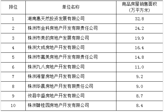 一、十强企业销售向好。2015年,按商品房屋销售面积排序,全市十强房地产企业共销售商品房154.4万平方米,比2014年十强企业销售面积增长25.5%,占全市房地产企业销售面积的23.4%。十强企业平均销售商品房15.4万平方米,是全市平均销售面积的9倍。销售面积在10万平方米以上的企业有6个,其中位列前三名的分别是湖南惠天然投资发展有限公司、株洲市金科房地产开发有限责任公司、株洲市美的房地产发展有限公司,销售面积分别为32.8、24.2、19.9万平方米。