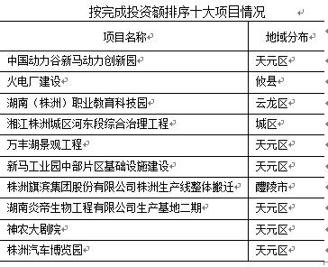二、十大项目拉动大。2015年,按项目当年完成投资额排序,十大项目完成投资100.1亿元,占全部投资额的4.6%,占全部亿元以上项目投资额的32.8 %。从十大项目的行业分布来看,基础设施项目5个、工业项目3个、民生工程项目2个。从十大项目的地域分布来看,8成落户城区。其中天元区6个、云龙示范区2个,攸县、醴陵市和跨区项目各1个。