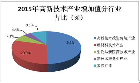(二)四大支柱产业地位进一步强化。 2015年,高新技术改造传统产业、新材料技术、生物与新医药技术和高技术服务业领域共实现高新技术产业增加值477.8亿元,同比增长18.0%,占全市高新技术产业增加值总量的90.9%。其中:高新技术改造传统产业实现高新技术产业增加值260.3亿元,占全市高新技术产业增加值总量的49.5%;新材料技术产业实现高新技术产业增加值157.4亿元,占全市高新技术产业增加值总量的29.9%;生物与新医药技术产业实现高新技术产业增加值37.2亿元,占全市总量的7.1%;高技术服务业产业实现高新技术产业增加值23.0亿元,占全市总量的4.4%。高新技术改造传统行业迅速发展,支撑产业增长的作用显著增强,成为产业整体平稳增长亮点。