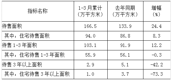 一季度,在多项利好政策带动下,全市房屋待售面积增速放缓。全市已竣工商品房待售面积166.5万平方米,同比增长24.4%,增速比上年同期回落6.1个百分点。其中,已竣工住宅待售面积94万平方米,同比增长8.3%,增速比上年同期回落14.4个百分点,占全部商品房已竣工待售面积的56.5%。1-3年及3年以上待售面积同比增速均有所回落,去库存初见成效。