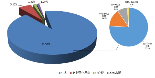 住宅销售呈现快速增长趋势。一季度,全市住宅销售面93亿平方米,同比增长39.7%,拉动全市商品房销售面积增长26个百分点,占全市商品房销售面积的91.5%,同比提高23.2个百分点。从户型结构上来看,90-144平米户型最受青睐, 90-144平米住宅销售面积70.6万平方米,同比增长49.6%,占住宅销售面积的75.9%,同比提高1.6个百分点;90平米以下住宅销售增速较快,同比增长51.2%,同比提高47.7个百分点;144平米以上住宅销售增速回落幅度较大,同比下降0.7%,同比回落41.1个百分点。办公楼销售面积同比下降53.8%,商业营业用房销售面积同比增长30.4%。