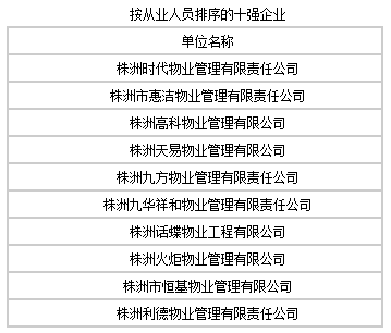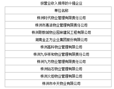 一、十强企业营业收入过半。2015年,十强企业实现营业收入1.98亿元,占全市物业管理企业单位总营业收入的62.1%,其中排名前三的分别是株洲时代物业管理有限责任公司、株洲市惠洁物业管理有限责任公司和株洲职教城物业园林建筑工程有限责任公司。