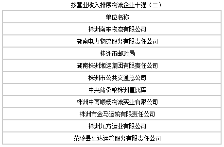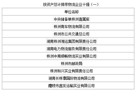 一、十强企业资产总计43亿。2015年全市物流企业法人单位中,资产排名前十的企业资产总计43.1亿元,占所有物流企业资产的88.6%。其中排名前三的分别是中央储备粮株洲直属库、株洲南车物流有限公司和株洲市公共交通总公司。