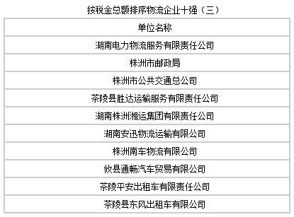三、十强企业贡献税收近0.35亿元。2015年全市物流企业法人单位中,按税金总额(含营业税金及附加、管理费用中税金和应交所得税)排名前十的企业完成税收0.47亿元,占全市物流企业法人单位税收总额的78.8%。其中,完税情况排名前三的企业依次是湖南电力物流服务有限责任公司、株洲市邮政局和株洲市公共交通总公司。