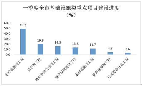 2、基础设施类项目稳步推进。一季度,全市96个基础设施类重点项目完成投资28.79亿元,占年度投资计划的12%。其中市政设施网工程完成投资4.97亿元,占年度投资计划的49.2%,信息网工程完成投资0.84亿元,占年度投资计划的19.9%,城市公共交通网工程完成投资14.17亿元,占年度投资计划的16.3%,特色城镇建设工程完成投资1.15亿元,占年度投资计划的13.8%,水利设施网工程完成投资4.21亿元,占年度投资计划的11.7%,能源保障网工程完成投资0.25亿元,占年度投资计划的4.7%,片区综合开发工程完成投资3.2亿元,占年度投资计划的3.6%。