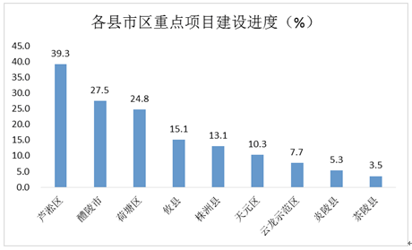 2、县市区建设进度不平衡。一季度,各县市区重点项目建设进度不平衡。进度较快的有:芦淞区、醴陵市、荷塘区,分别完成年计划的39.3%、27.5%、24.8%(不含跨区项目,下同)。进度较慢的有茶陵县、炎陵县、云龙示范区、石峰区,分别完成年投资计划的3.5%、5.3%、7.7%、8%。