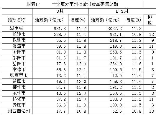 一季度,全市上下千方百计稳增长,想方设法活消费,消费基础性作用较好发挥。实现社会消费品零售总额218.7亿元,总量前进一位,居全省第4位,同比增长11.3%,增速比1-2月加快0.2个百分点,比全国平均水平快1个百分点,高于全省平均水平0.1个百分点,居长株潭地区第1位,全省第9位,与1-2月位次相同,总体呈稳中有升的发展态势。