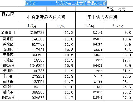二是区域增长参差不齐。一季度县域和城区消费品市场两极分化明显,差距较大。从限额以上消费品零售额增速来看,县域增长27%,城区仅增长3.5%,两者相差24.5个百分点。从全市零售额增长情况看,增速最高的株洲县达11.9%,最低的天元区增长10.5%,两者差距达1.4个百分点,比1-2月缩小0.5个百分点。
