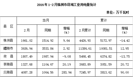1-2月,除株洲县和攸县的工业用电量同比分别下降14.4%和13.8%以外,炎陵县、茶陵县和醴陵市用电量同比分别增长90%、20.7%和13%。