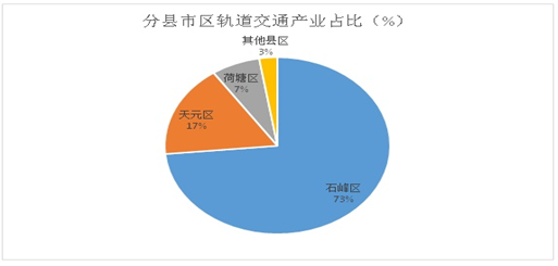 二是石峰区总量最大。2015年,石峰区轨道交通产业总量为738.1亿元,占全市的比重为73.5%;天元区总量次之,为169.8亿元,占比16.9%。