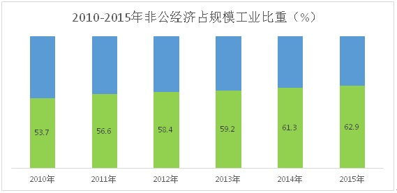 二是占比逐年提高。“十二五”期间,全市非公经济增加值占规模工业的比重逐年提高,分别为56.6%、58.4%、59.2%、61.3%和62.9%,2015年比2010年占比提高了9.2个百分点。