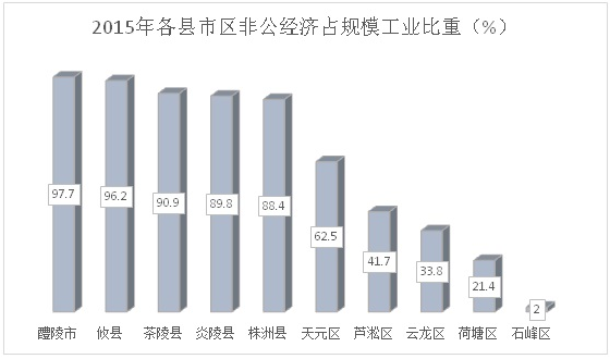 三是县域占比大。2015年,县域非公有制工业企业实现增加值571亿元,占全市非公工业增加值的比重为83.6%;城区非公工业实现增加值112.2亿元,占比16.4%,比县域低67.2个百分点。醴陵市和攸县非公经济占规模工业增加值的比重最大,分别为97.7%和96.2%。
