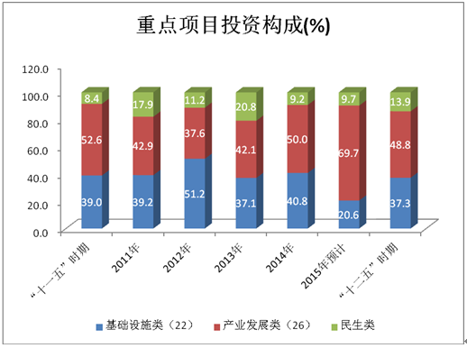 1、民生投资比例提高。“十二五”期间,全市着力改善民生,增加民生投入,民生项目投资比重提高。重点项目投资中,民生类占13.9%,比“十一五”时期提高5.5个百分点;基础设施类占37.3%,比“十一五”时期降低1.7个百分点;产业类占48.8%,比“十一五”时期降低3.8个百分点。