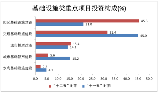3、园区建设提档升级。“十二五”时期,以提高园区承载能力为突破口,各级园区加大基础设施建设,推进园区提档升级,园区基础设施投资比重提升。基础设施类重点项目投资中,园区基础设施项目占45.3%,比“十一五”时期提高24.3个百分点;城市提质改造项目占15.4%,比“十一五”时期提高1.3个百分点;交通基础设施建设项目占31.4%,比“十一五”时期降低13.6个百分点;水利基础设施建设项目占2.2%,比“十一五”时期降低2.5个百分点。