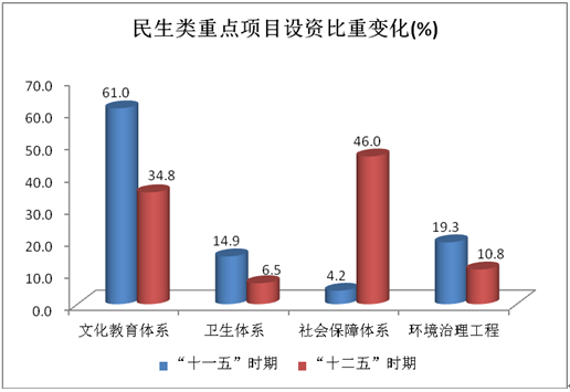 4、社会保障不断强化。“十二五”期间,全市突出民生改善,加强社会保障体系建设,发展成果更加惠民。民生类重点项目投资中,社会保障体系项目占46%,比“十一五”时期提高41.8个百分点;文化教育体系项目占34.8%,经“十一五” 时期降低26.2%;环境治理工程项目占10.8%,比“十一五” 时期降低8.5个百分点;卫生体系建设项目占6.5%,比“十一五” 时期降低8.4个百分点。